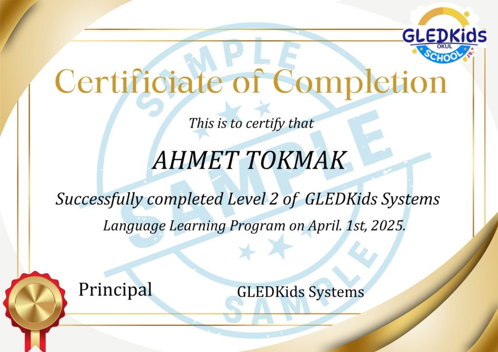 GLEDKids Eğitim Programı, çocukların Milli Eğitim Bakanlığı’na bağlı sınavlara hazırlanmasını desteklemekle kalmaz; aynı zamanda kendi bünyesinde yer alan GLEDKids Sertifikası ile öğrencileri onurlandırır. Bu sertifika, çocukların uluslararası geçerliliğe sahip sınavlara hazırlık sürecini destekler ve özellikle YLE, TOEFL Junior ve TOEIC Junior gibi yurt dışı sınavlara güçlü bir temel oluşturur.